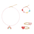 Dazu passt das Armband mit bunten Herzchen-Anhängern, das jedes Outfit spielerisch ergänzt. Abgerundet wird das Set durch eine Halskette mit Regenbogen-Anhänger – ein Symbol für Freude, Freundschaft und Fantasie. Das perfekte Geschenk für kleine Regenbogenfans!