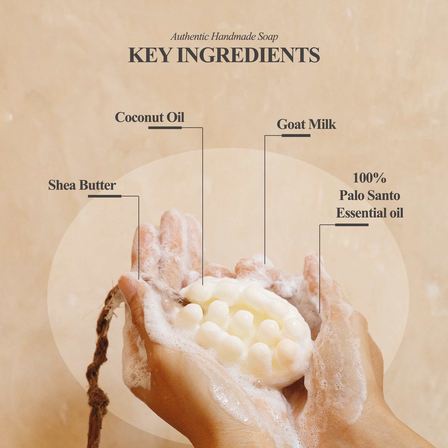 Angereichert mit nährender Sheabutter und Ziegenmilch spendet die Seife intensiv Feuchtigkeit, beruhigt empfindliche oder gereizte Haut und unterstützt die Regeneration der Hautbarriere. Der warme, leicht süssliche Duft des Palo Santo wirkt erdend, entspannend und ausgleichend – ideal für Momente bewusster Selbstpflege.