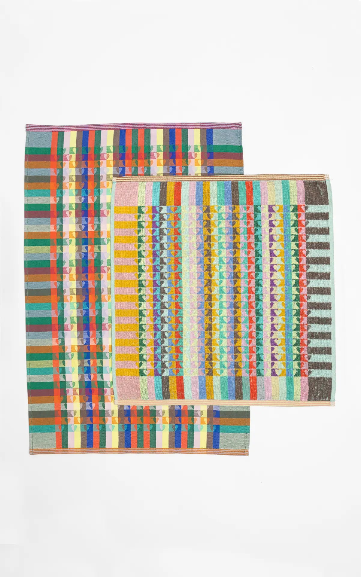 Das farbenfrohe Tuch-Set von Foekje Fleur besteht aus einem Küchentuch und einem etwas kleineren Geschirrtuch – beide mit verspieltem Herzchenmuster, das aus überschüssigen Garnen gewebt wurde.
