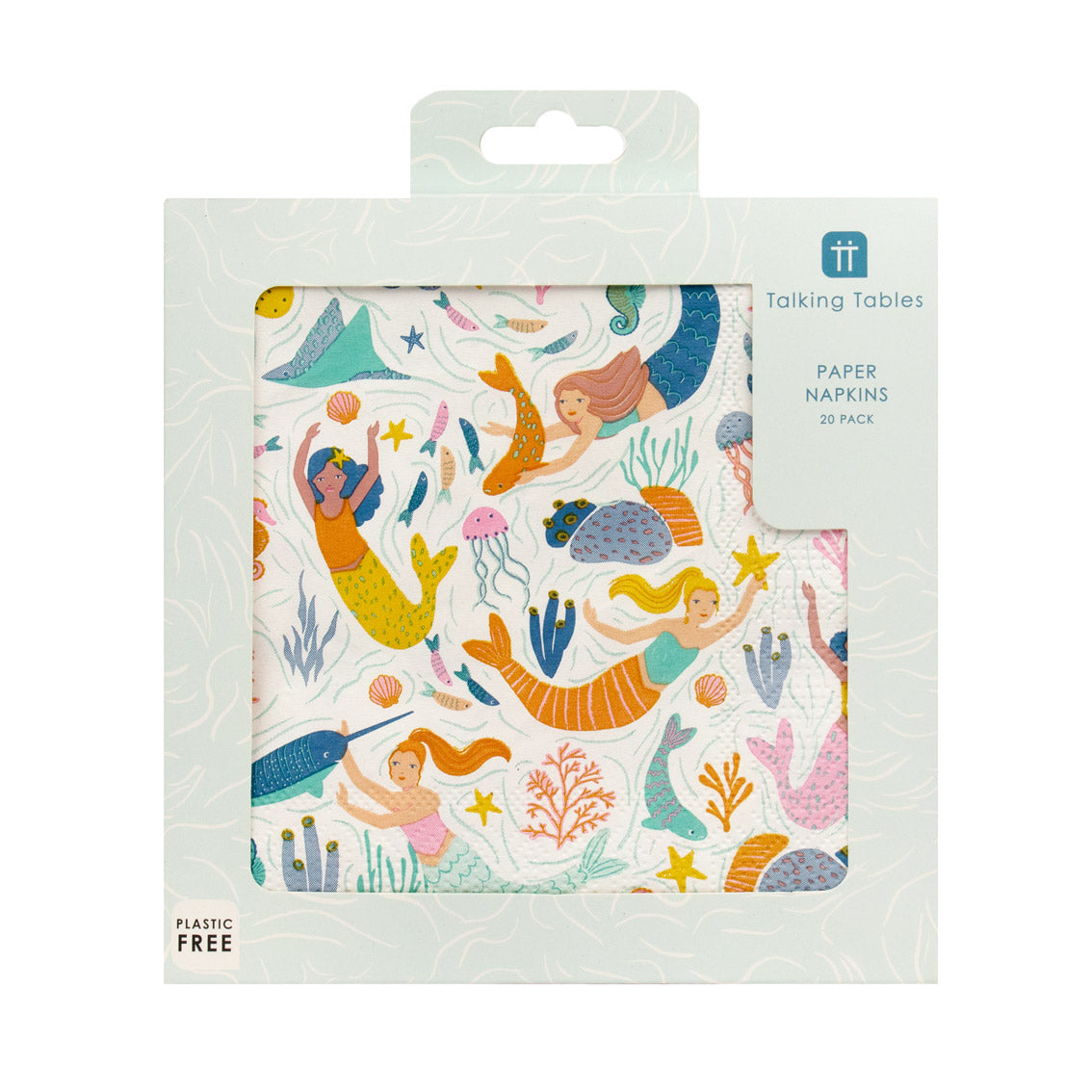 Perfekt für kleine Meerjungfrauen-Fans: Diese fröhlich illustrierten Servietten entführen Kinder in eine lebendige Unterwasserwelt voller Fische und zauberhafter Meerjungfrauen und bringen Fantasie und Farbe auf jeden Partytisch.