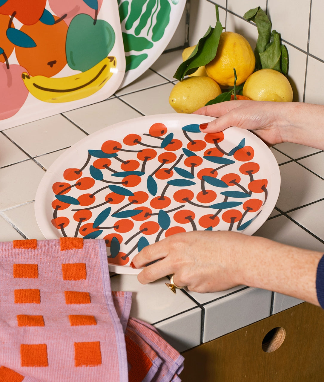 Ein Hauch Sommer auf dem Tisch: Dieses charmante Rundtablett mit Kirschmotiv sorgt für gute Laune – ob beim Brunch, Picknick oder als farbenfrohes Deko-Element.