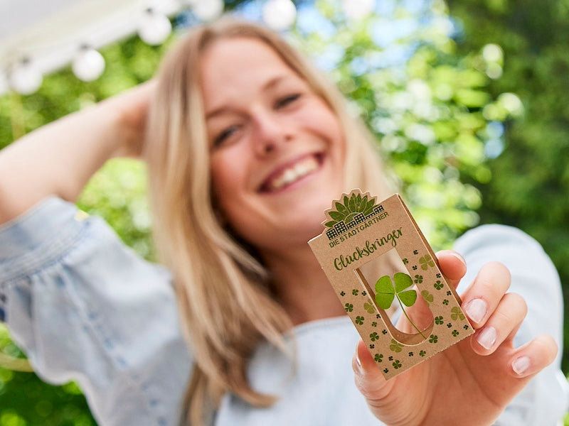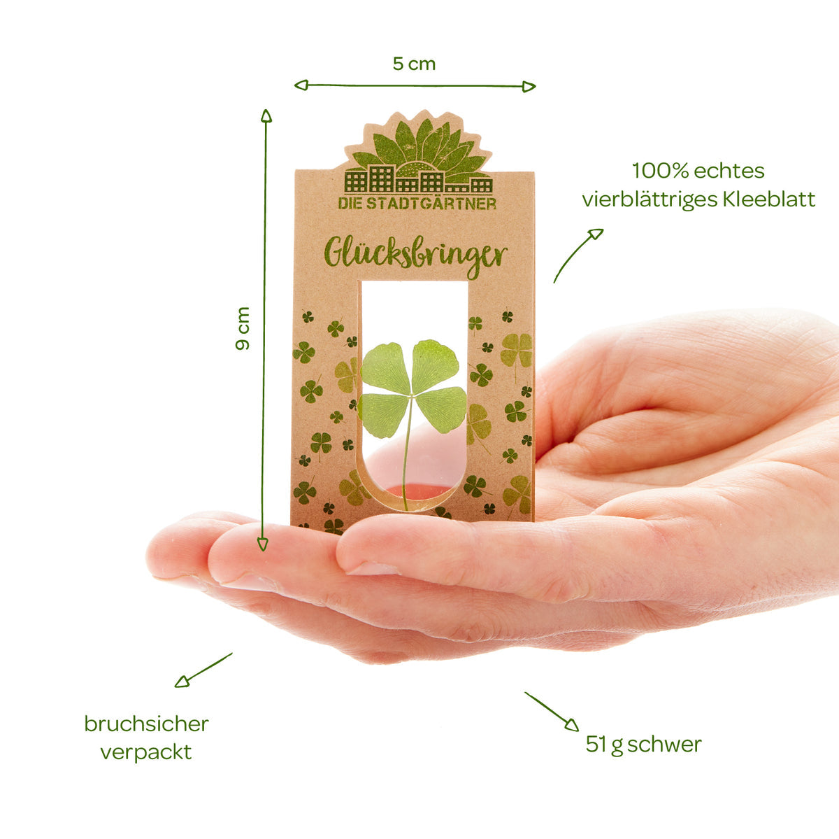 Kleines Geschenk, grosse Wirkung: Dieser handverlesene Glücksbringer mit einem echten vierblättrigen Kleeblatt ist ein liebevolles Zeichen für Glück, Hoffnung und Zuversicht. Eingefasst zwischen zwei Glasscheiben und hübsch verpackt in einem naturfarbenen Kartonrahmen mit Kleeblatt-Muster, wird er zum besonderen Mitbringsel für viele Anlässe.