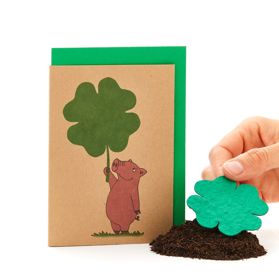 Ein echter Glücksbringer: Diese charmante Karte zeigt ein rosa Schweinchen mit einem riesigen vierblättrigen Kleeblatt – und genau dieses Blatt besteht aus grünem Saatpapier! Einfach abziehen, einpflanzen, giessen – und bald spriessen Wildblumen als Symbol für neues Glück.