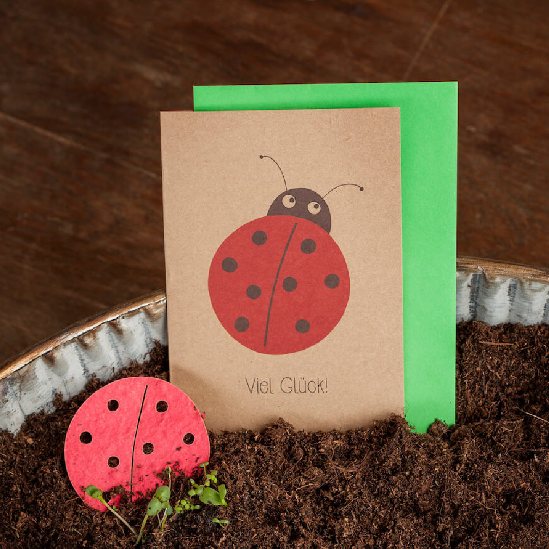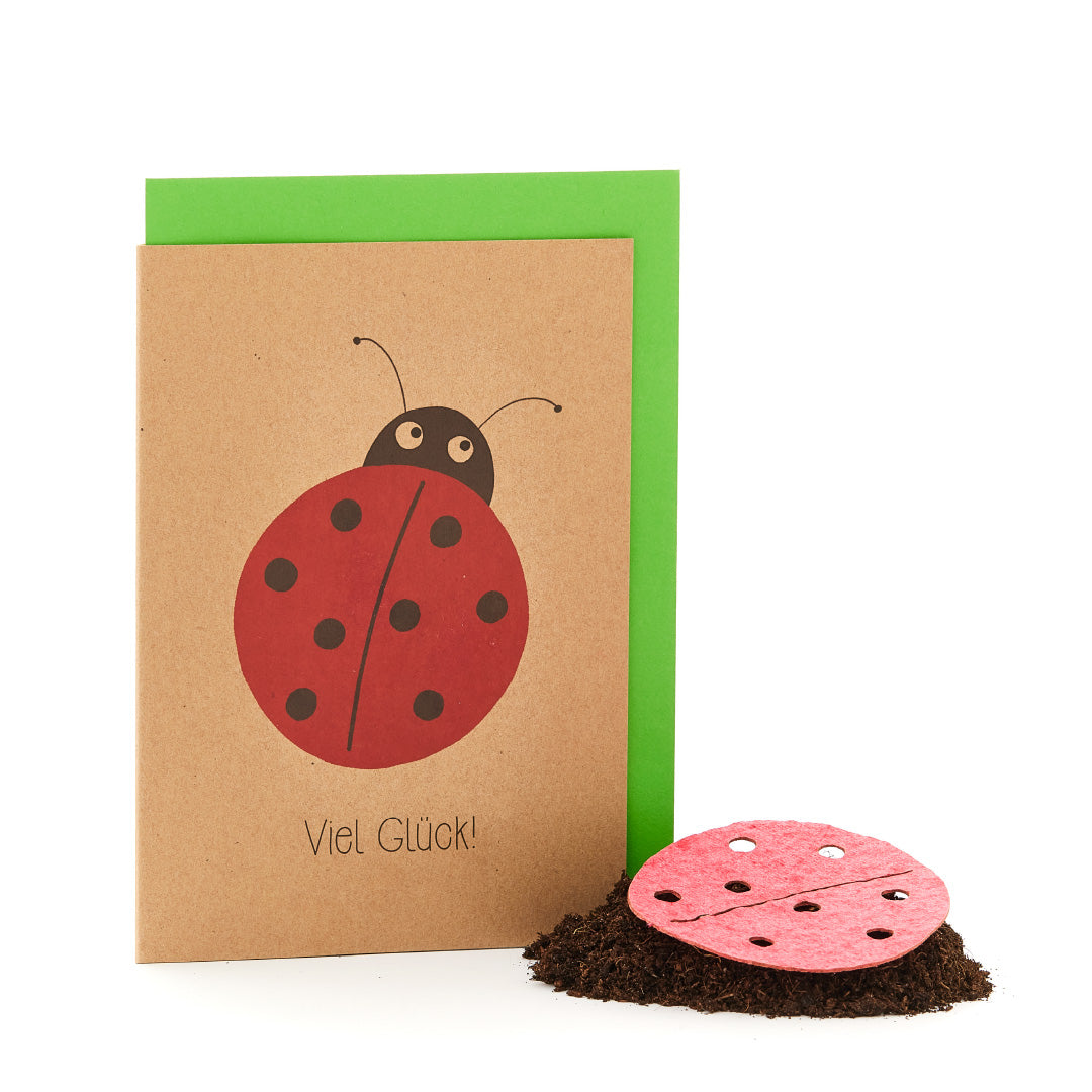 Dieser kleine Käfer bringt grosses Glück – und lässt es erblühen. Die fröhliche Glückwunschkarte zeigt einen klassischen Marienkäfer mit dem Text „Viel Glück!“ auf naturfarbenem Kraftpapier. Das Besondere: Der Käfer ist aus pflanzbarem Saatpapier gefertigt und lässt sich ganz einfach einpflanzen. Nach wenigen Wochen wachsen daraus farbige Wildblumen – ein liebevolles Symbol für Hoffnung und Neuanfang – ob zum Schulanfang, vor Prüfungen, für neue Wege oder einfach als kleine Geste.