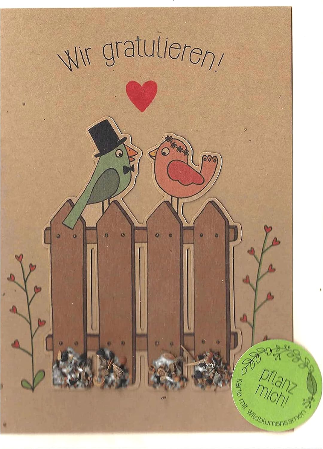 Zwei Vögel, ein Zaun, ein Herz – diese liebevoll gestaltete Hochzeitskarte sagt stilvoll „Herzlichen Glückwunsch!“. Ob zur Hochzeit, Verlobung oder zum Jubiläum: Das romantische Vogelpaar mit Zylinder und Blumenkranz ist ein schöner Blickfang. Das Besondere? Die Vögel bestehen aus pflanzbarem Saatpapier und lassen nach dem Einpflanzen farbige Wildblumen wachsen – als blühender Glückwunsch mit Symbolkraft.