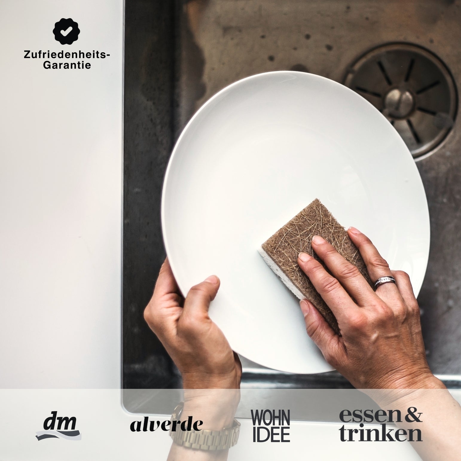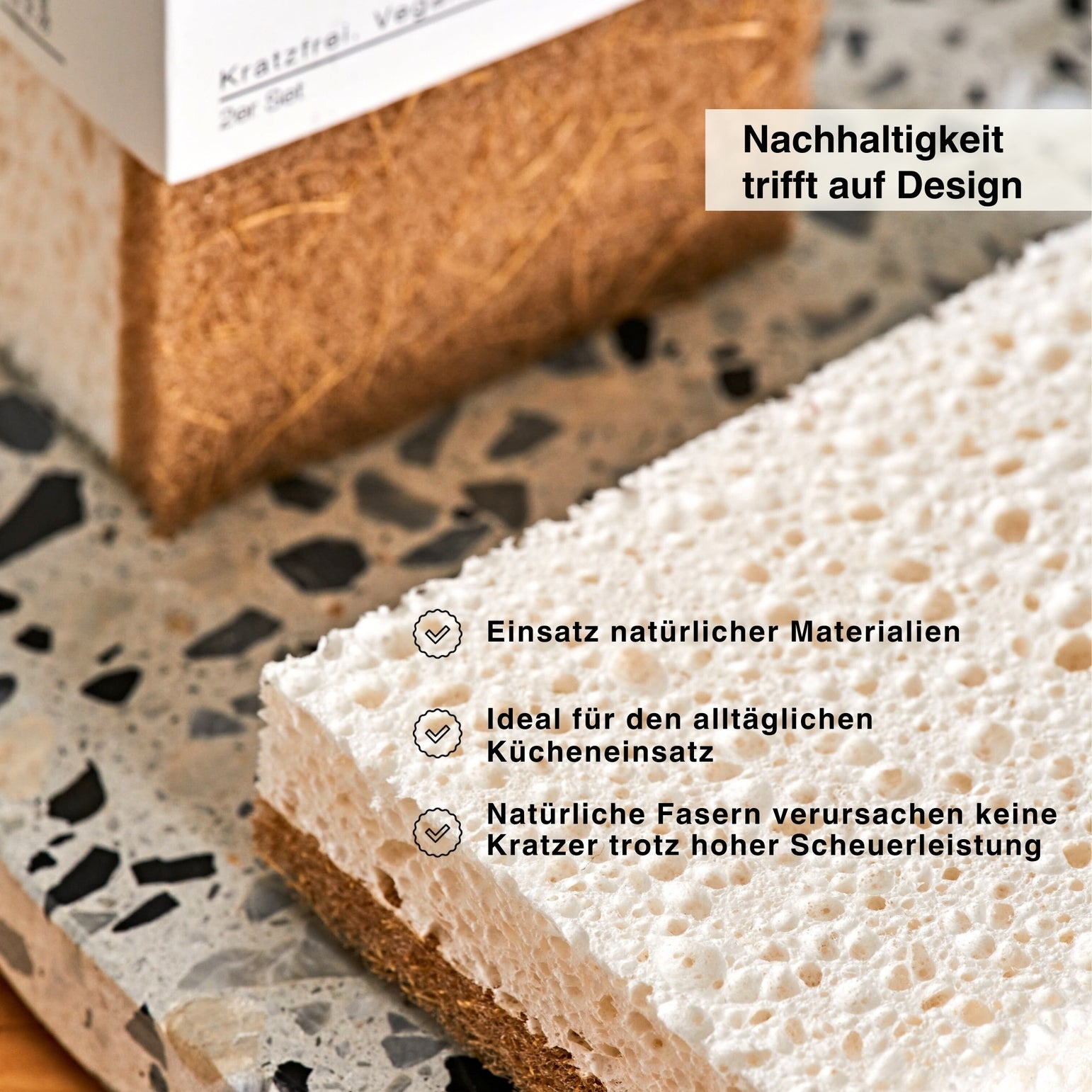 Die robuste Scheuerseite aus feiner Kokosfaser entfernt hartnäckigen Schmutz zuverlässig, ohne empfindliche Oberflächen zu verkratzen. Die weiche Schwammseite aus Holz-Zellulose nimmt Feuchtigkeit besonders effektiv auf – ideal für den täglichen Einsatz in Küche und Haushalt.