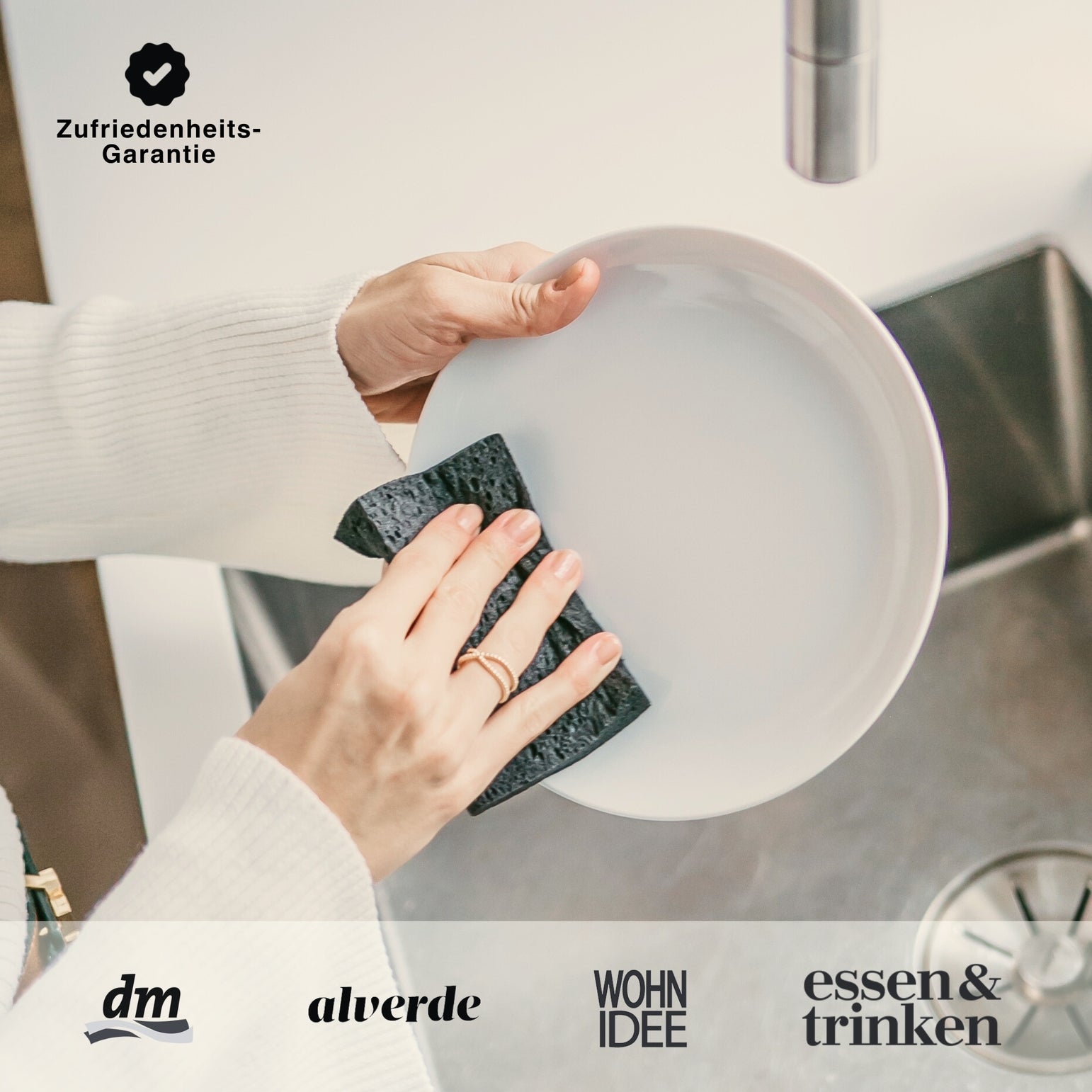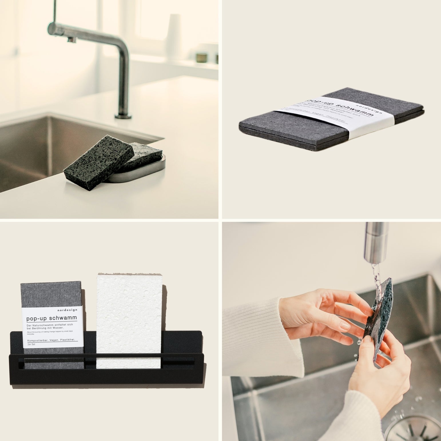 Erlebe den faszinierenden Pop-Up Effekt: Der nordesign Schwamm entfaltet sich beim ersten Kontakt mit Wasser zu seiner vollen Grösse. In elegantem Schwarz gehalten, passt er perfekt in moderne Küchen und setzt ein minimalistisches Design-Statement – ganz ohne bunte Plastikschwämme.