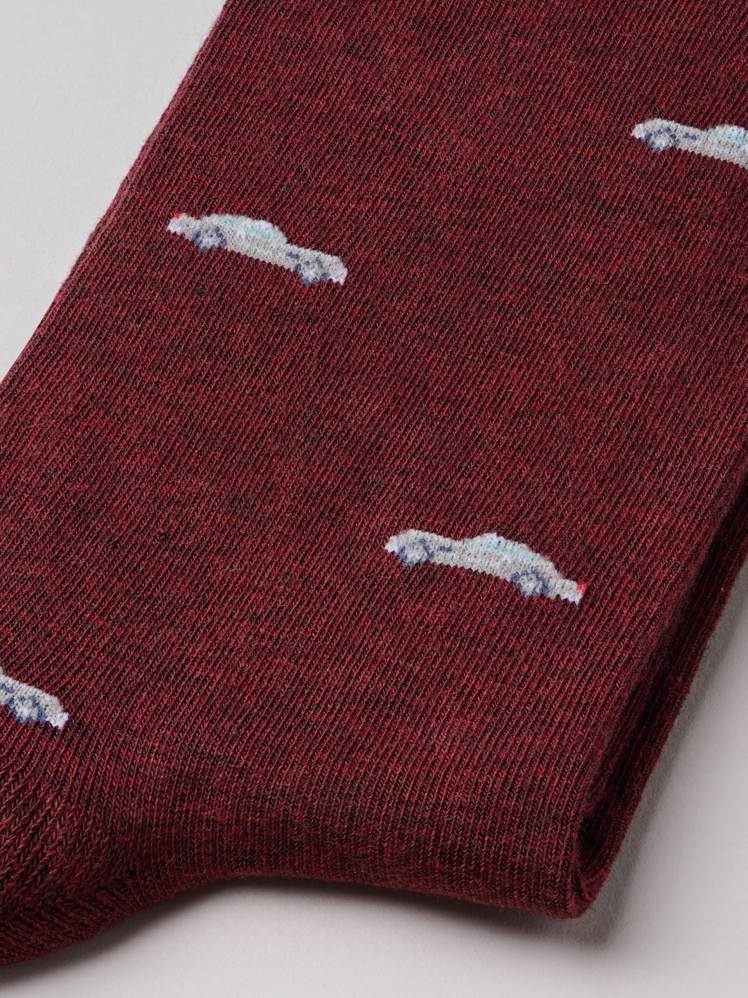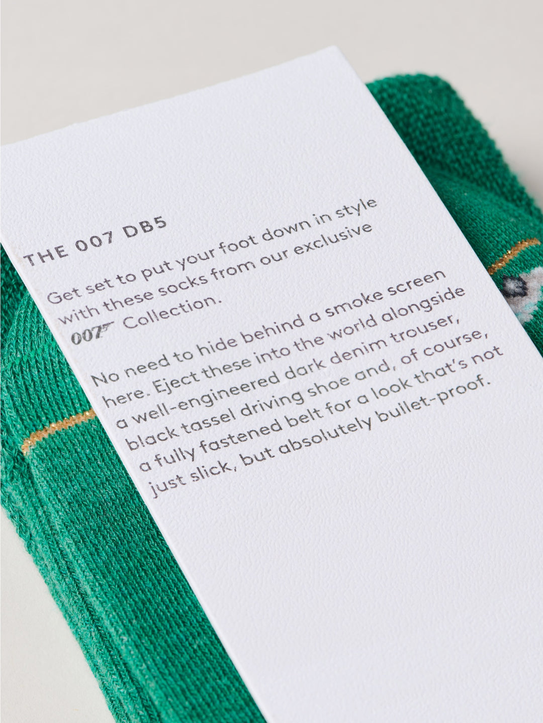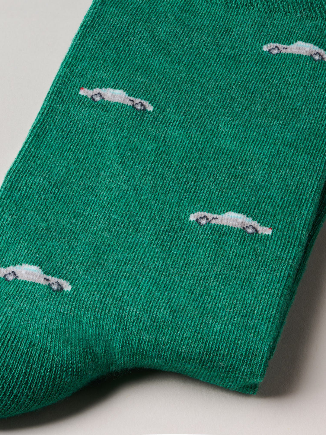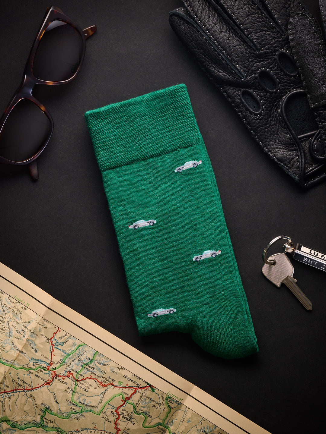 Der wohl berühmteste Dienstwagen der Filmgeschichte jetzt als Design-Statement für deine Füsse. Auf Racing-Green oder tiefem Bordeauxrot fahren die detailreich eingearbeiteten Miniatur-Autos im klassischen Silberton – eine Hommage an den legendären Aston Martin DB5 aus GoldenEye und unzähligen weiteren Bond-Abenteuern.