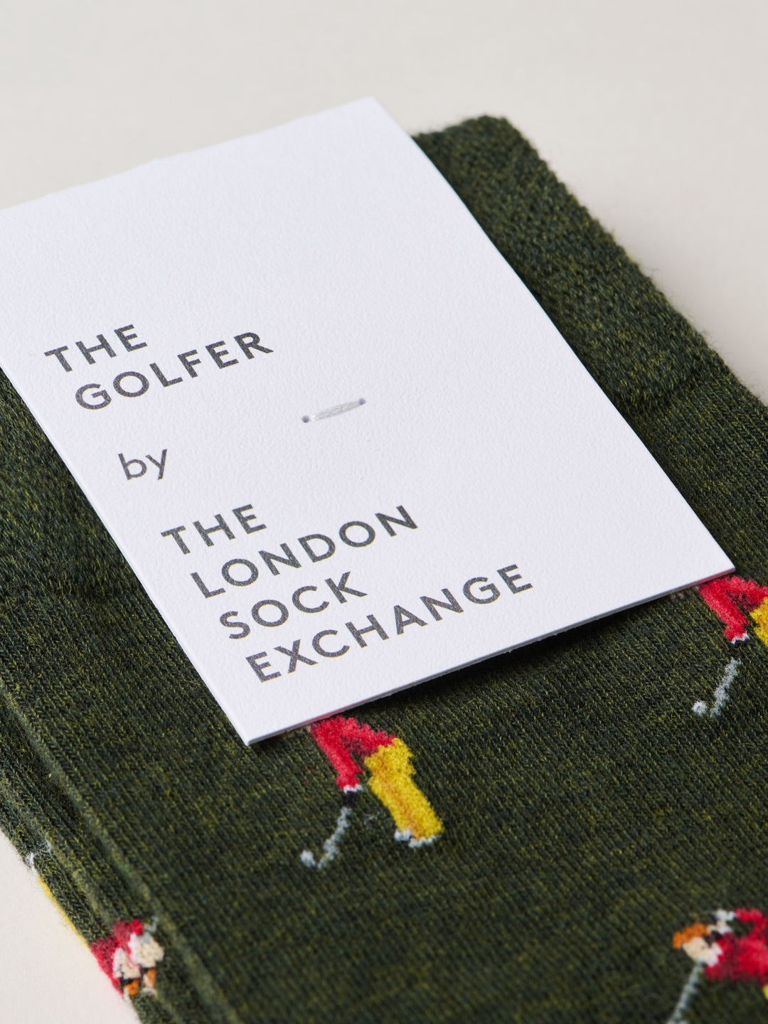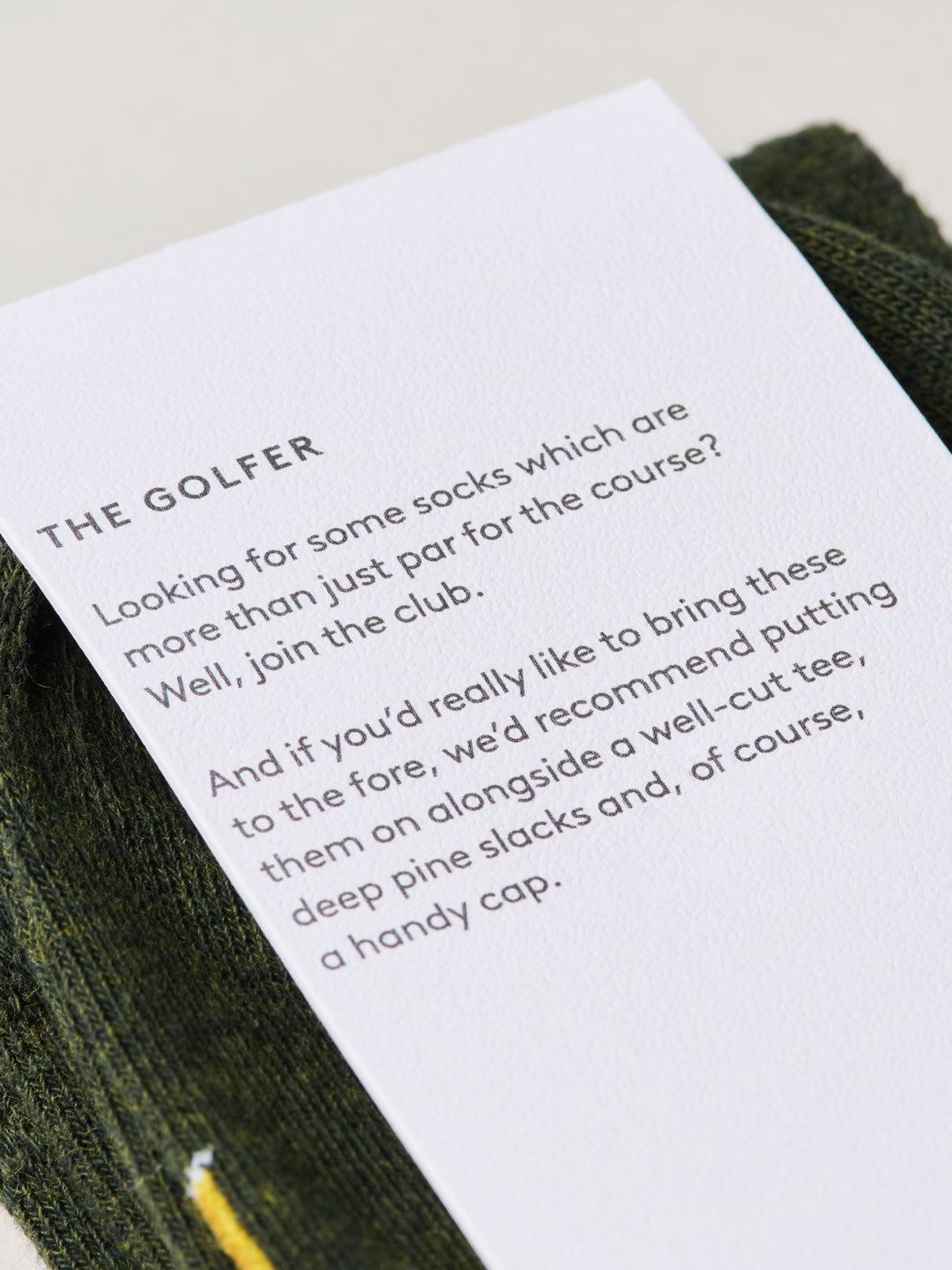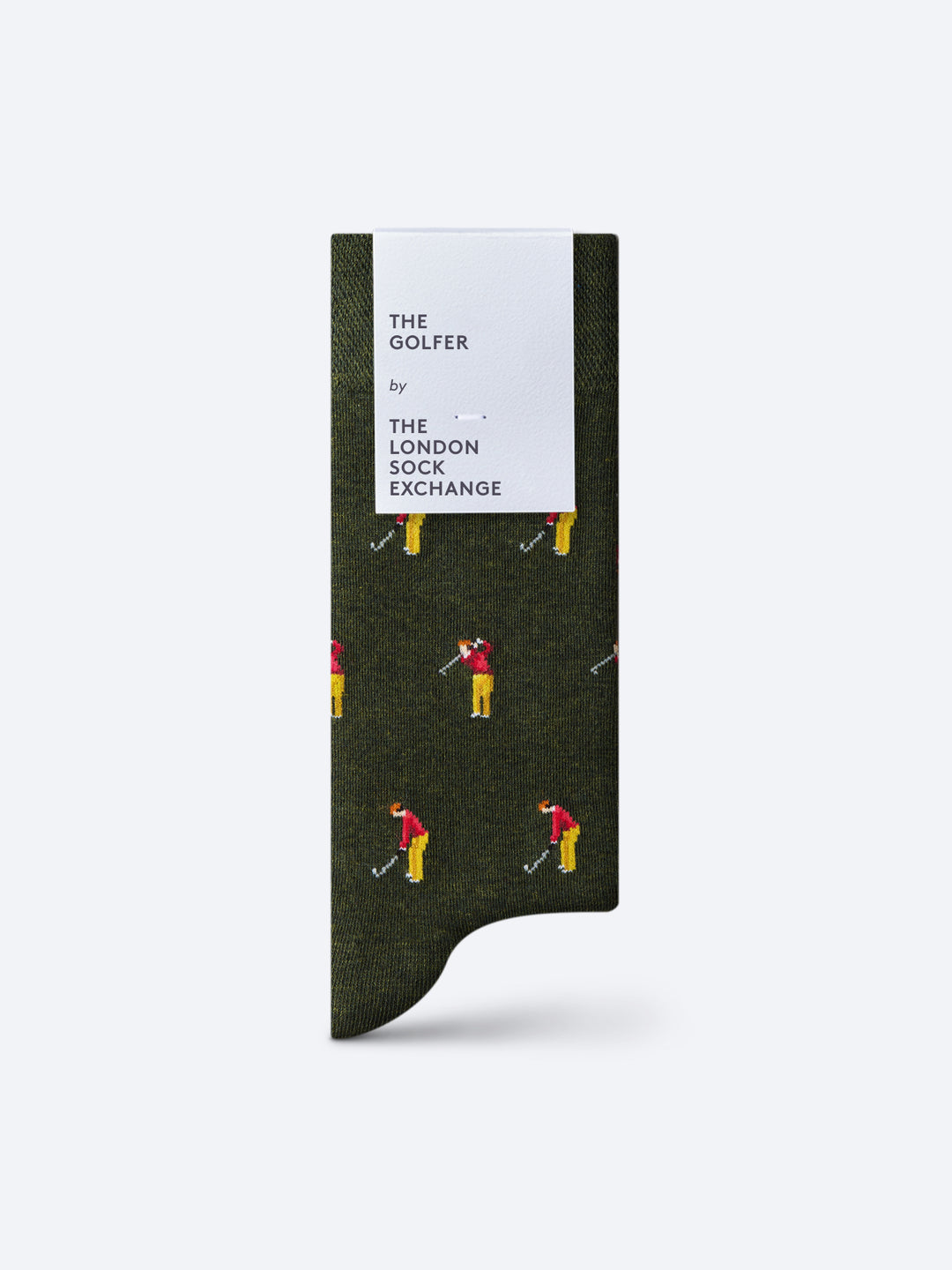Ein stilvoller Schwung: Die Socken The Golfer von The London Sock Exchange zeigen detailreich illustrierte Golfspieler in Aktion – vom Abschlag bis zum perfekten Finish. Das Motiv auf tiefgrünem Hintergrund bringt sportliche Eleganz an den Fuss und ist ein passendes Geschenk für alle, die den Golfsport lieben.