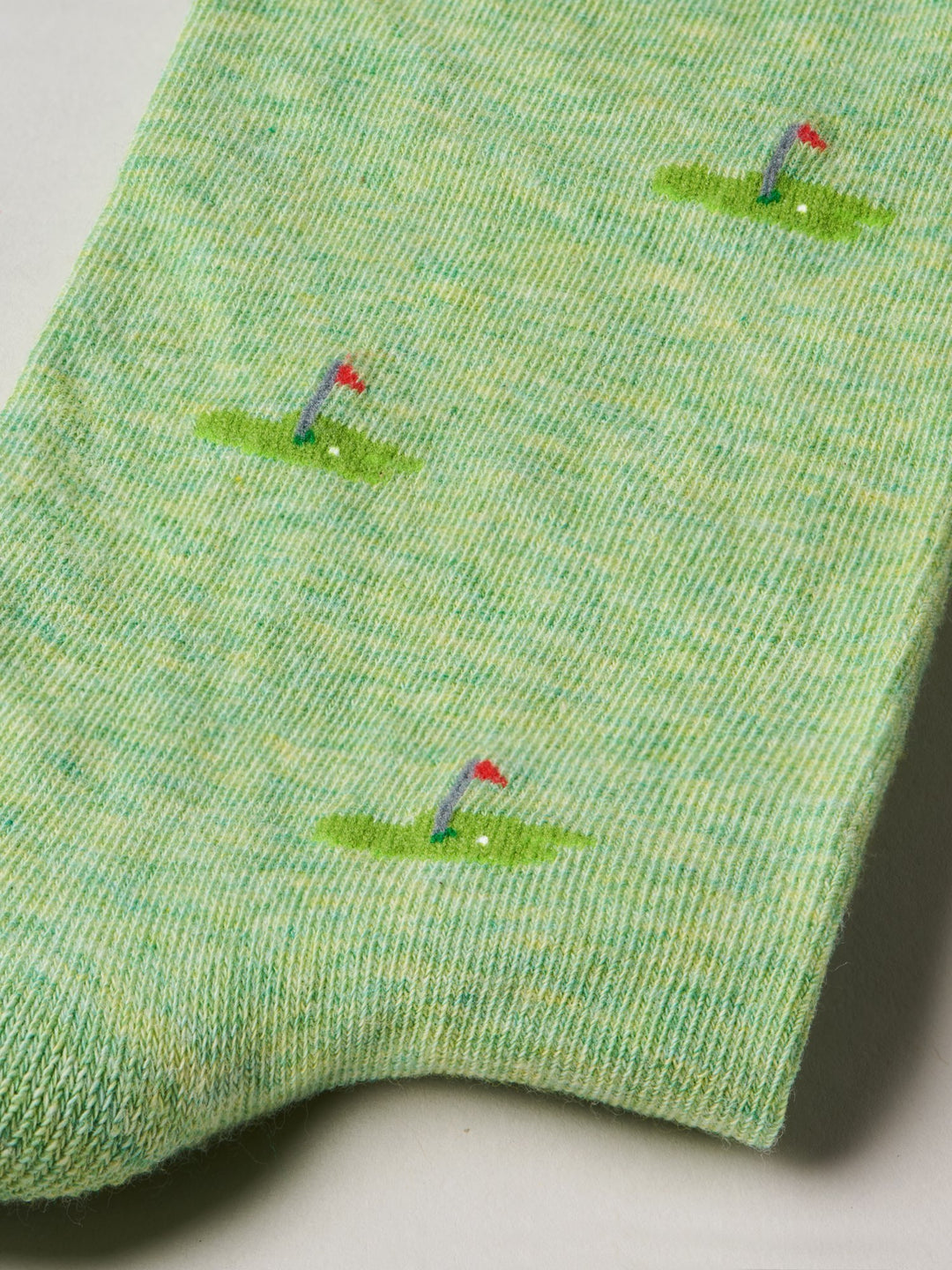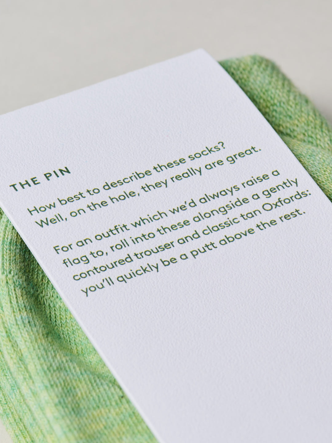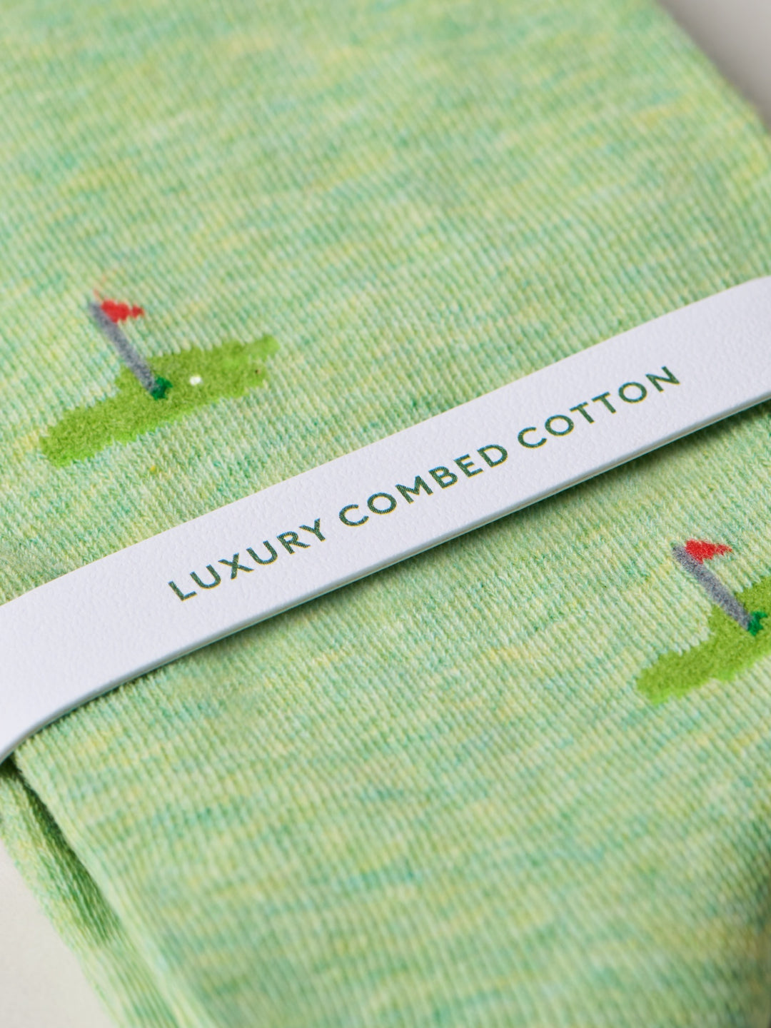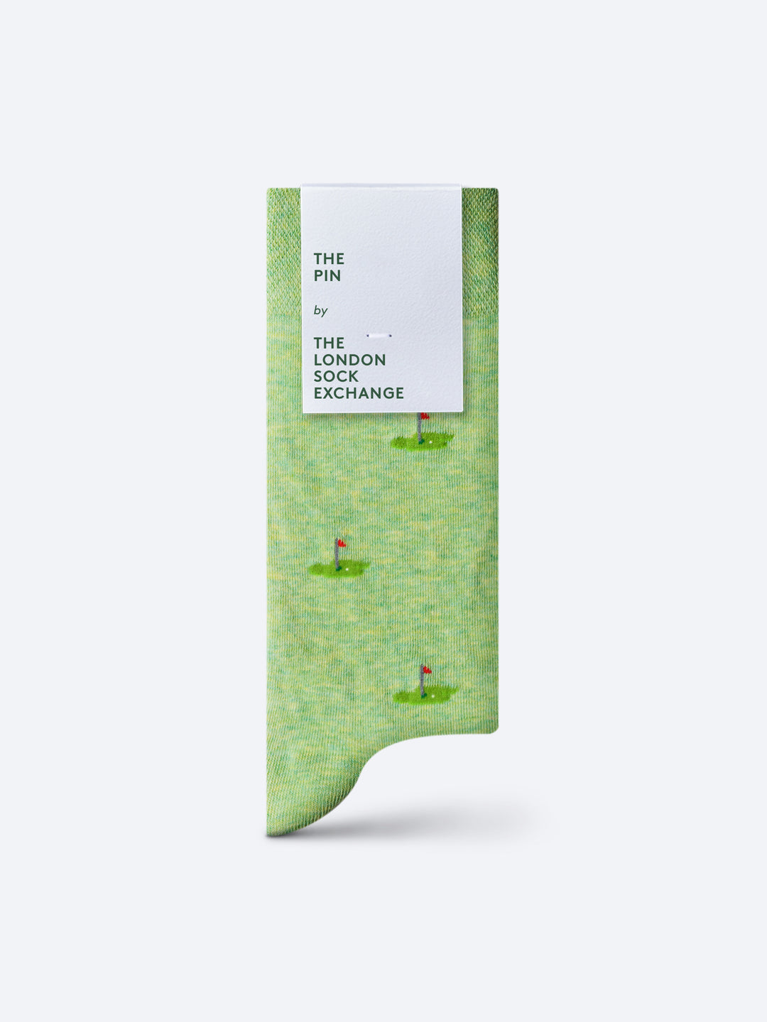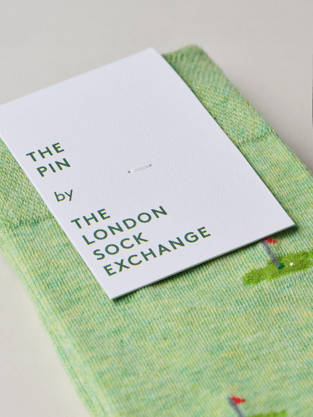 Ein Hole-in-One für den Look: Die Socken The Pin von The London Sock Exchange bringen Golfflair in den Alltag. Das verspielte Design zeigt kleine Putting Greens mit rotem Fähnchen auf frischem Grün – ein stilvolles Detail für alle, die den Sport lieben oder ihren Outfits einen sportlich-eleganten Twist verleihen wollen.
