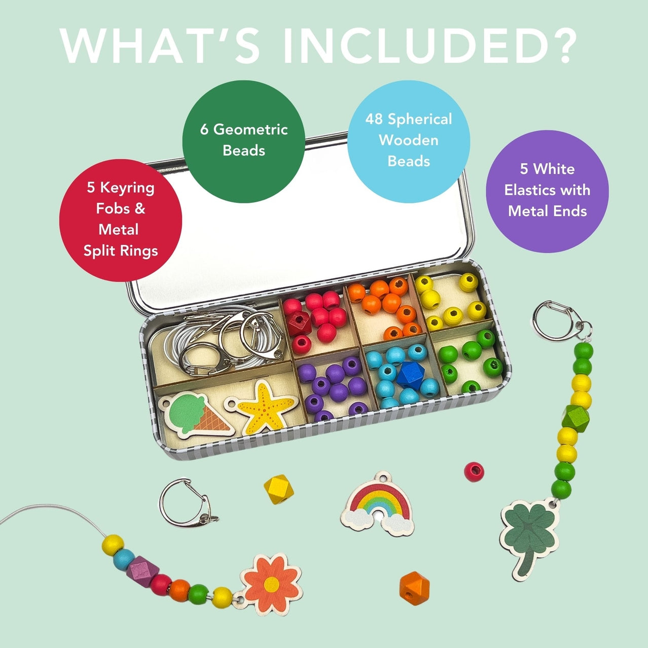 Verpackt in einer praktischen, wiederverwendbaren Metalldose enthält das Set alles, was kleine Hände zum Gestalten brauchen: 5 Holzanhänger, 50 bunte Holzperlen, 6 geometrische Holzperlen, 5 Schlüsselringe sowie elastische Schnüre mit Metallenden für einfaches Auffädeln.