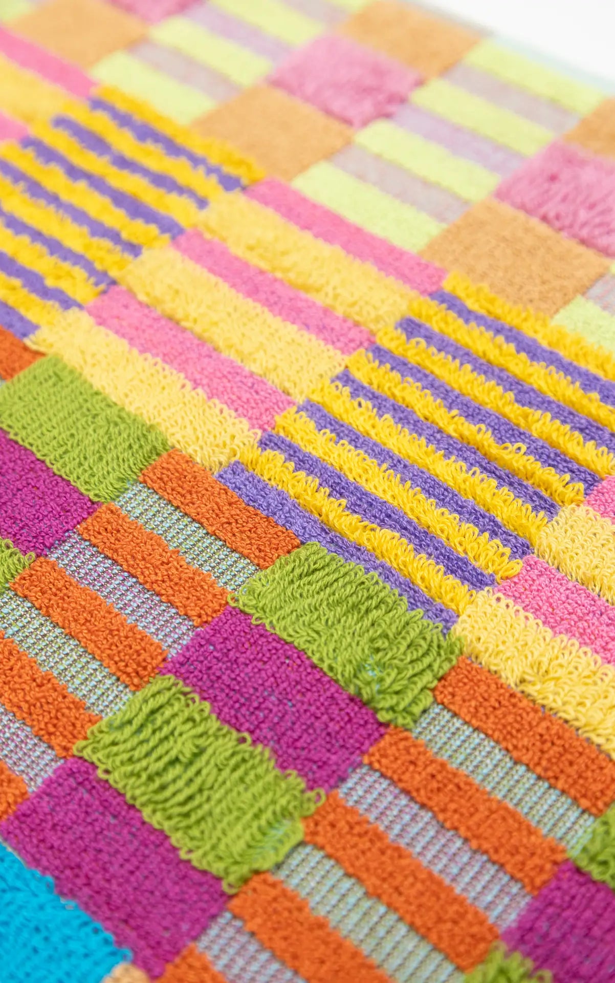 Die Tulip Quilt Badematte von Foekje Fleur ist ein echtes Statement. Gefertigt aus Garnüberschüssen der Textilindustrie entsteht ein unverwechselbares Muster mit leuchtenden Farben und weicher Struktur.