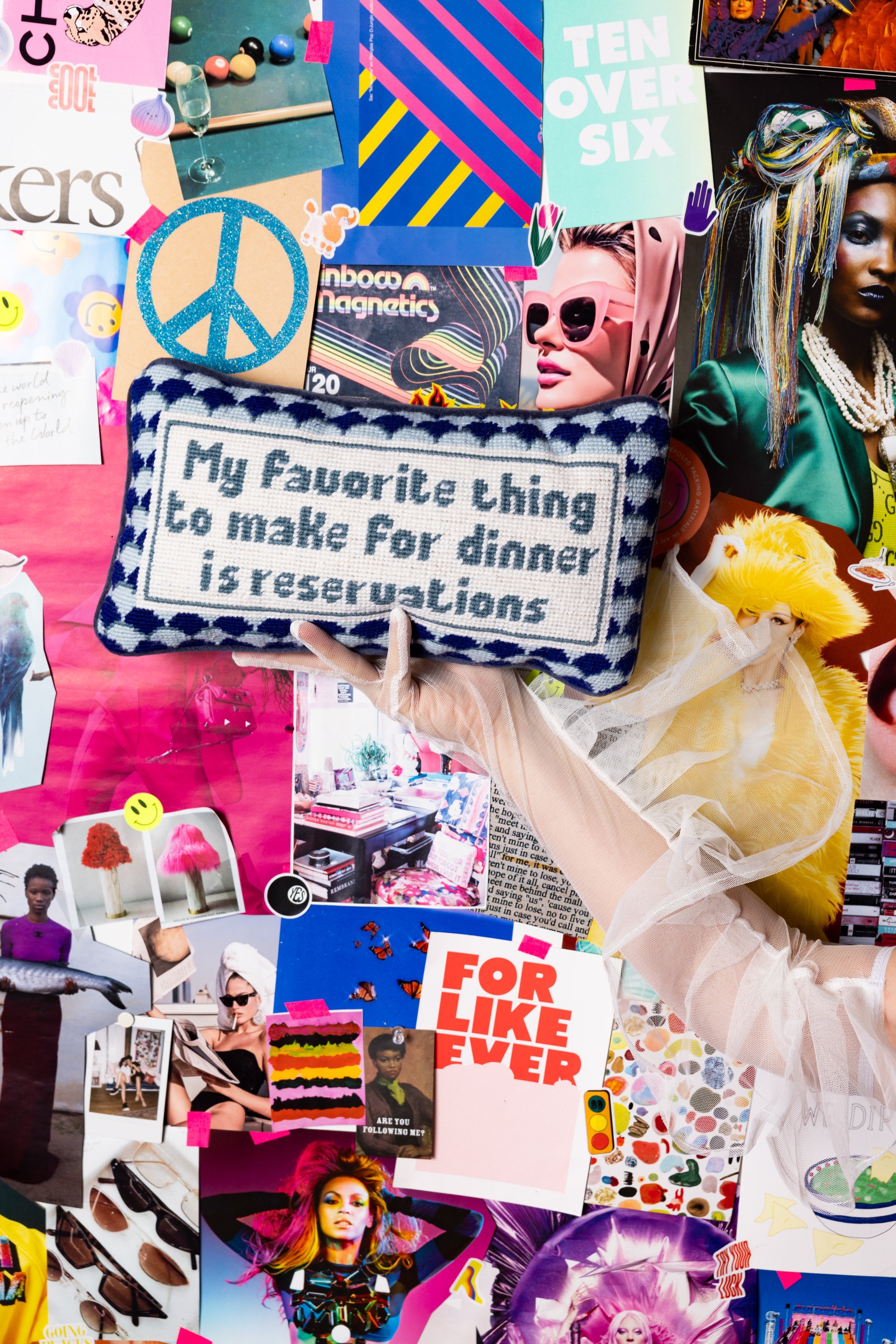 Kochen ist nicht dein Ding? Dieses Kissen versteht dich. Das Gobelin-Kissen Reservations von Furbish Studio bringt Humor auf dein Sofa oder ins Esszimmer – mit dem augenzwinkernden Statement: „My favorite thing to make for dinner is reservations.“