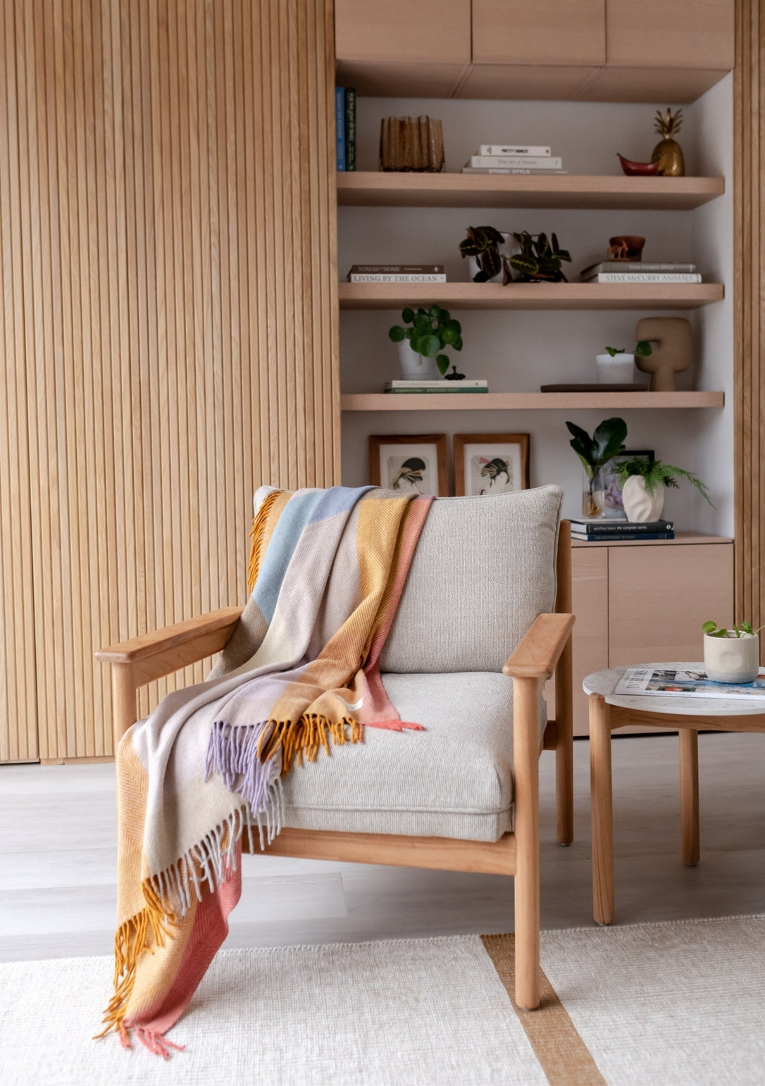 Gefertigt wird die Decke aus 70 % recycelter Wollkleidung und 30 % recycelten Mischfasern, die ansonsten auf der Abfalldeponie gelandet wären. In einer familiengeführten Manufaktur gewebt, vereint sie traditionelle Handwerkskunst mit moderner Nachhaltigkeit.