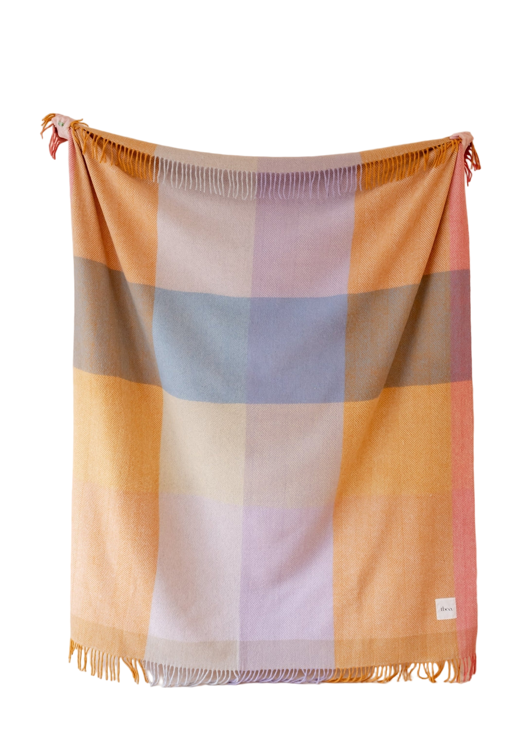 Die Mustard Frame Check Decke verbindet warme Senfgelb-Töne mit sanftem Lila und kühlem Blau in einem grosszügigen Blockkaromuster. Dieses moderne Design bringt frische Akzente ins Wohnzimmer, Schlafzimmer oder auch auf die Terrasse – ein echter Eyecatcher für alle, die farbliche Statements lieben.