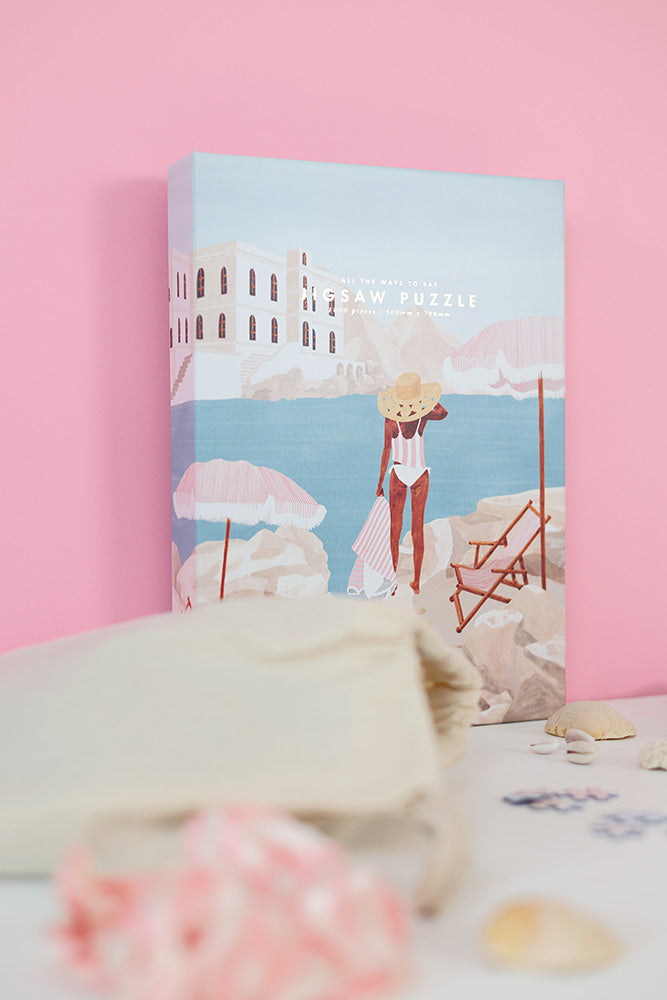 Sonnenschirm, Sonnenhut und türkisblaues Meer: Dieses Motiv entführt Dich an die italienische Riviera – mit ihrer charakteristischen Architektur, den hellen Felsstufen und entspannten Strandmomenten. Eine elegante Frau steht bereit für einen Tag am Wasser – und lädt Dich ein, beim Puzzeln in Gedanken mitzureisen.