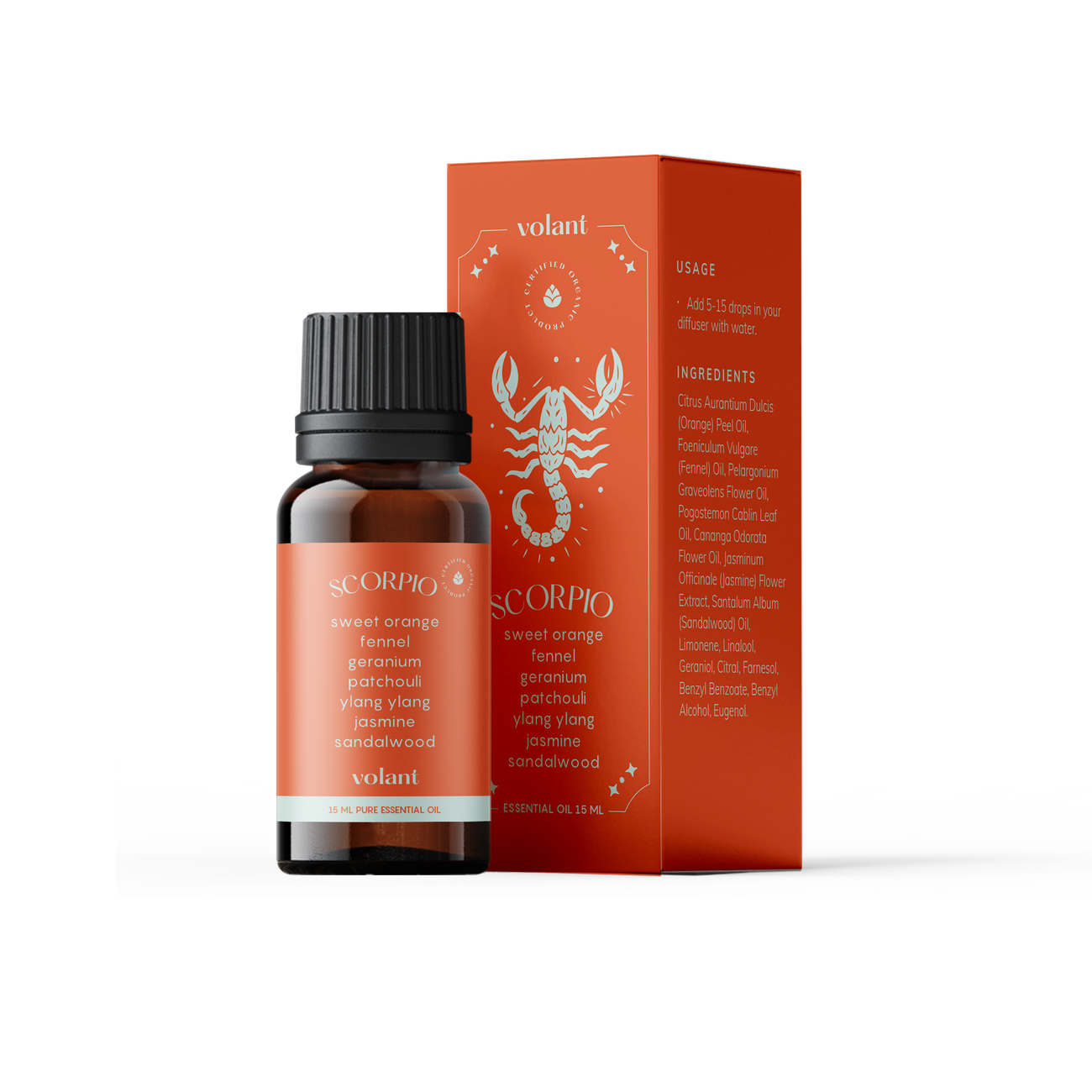 Der Scorpio Blend von Volant wurde für den Skorpion entwickelt – das Sternzeichen der Tiefe, Leidenschaft und Transformation. Spritzige Orange und Fenchel durchbrechen emotionale Nebel, während Ylang Ylang und Geranie deine Gefühle sanft in Bewegung halten, ohne dich zu überfluten.